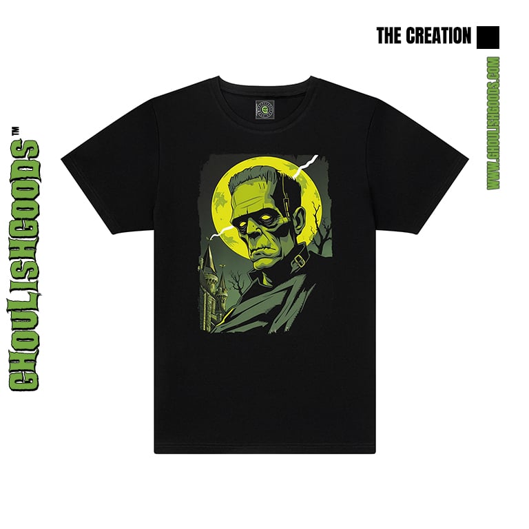 Command attention with "The Creation" tee, an electrifying design featuring Frankenstein's monster. Exclusive design only available from GhoulishGoods.