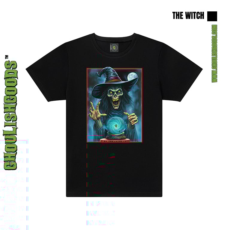Add a touch of dark magic to your wardrobe with this chilling tee, titled 'The Witch'. Exclusive design only available from GhoulishGoods.